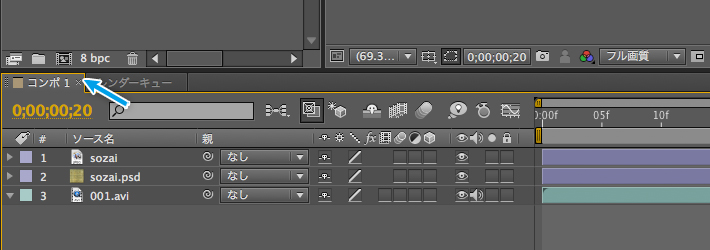 ファイルに書き出したいコンポジションを「タイムラインパネル」から選択します。
