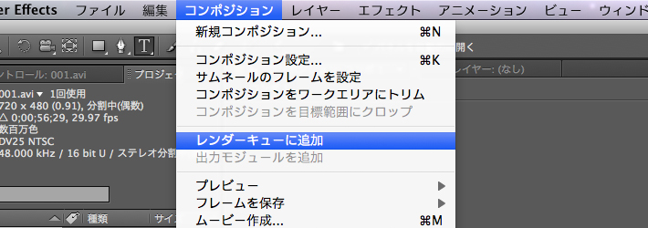 [コンポジション]メニューの[レンダーキューに追加]を選択します。