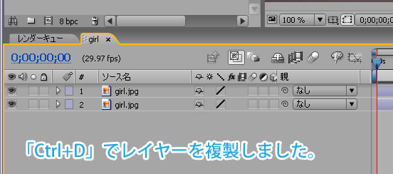 素材をコンポジションに配置し、レイヤーを選択→「Ctrl+D」でレイヤーを複製します。