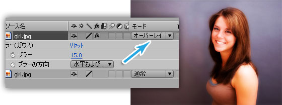 複製したレイヤーの「描画モード」を「オーバーレイ」にします。