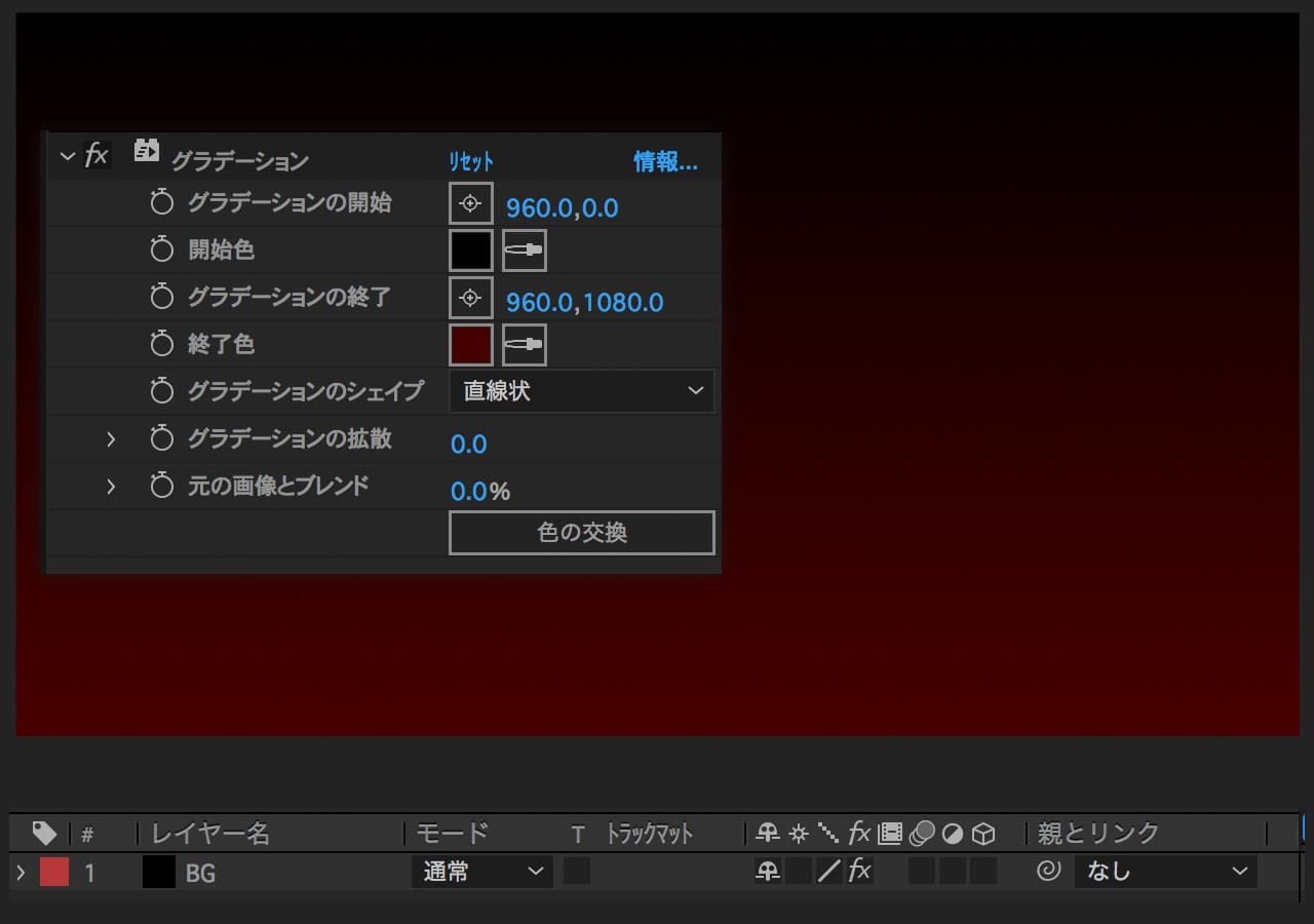 作成した平面に、エフェクトの「グラデーション」を適用し、画像を参考に値を設定します。「グラデーション」の値