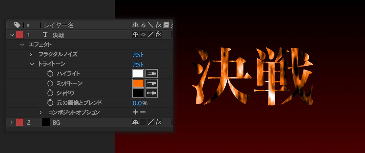 炎の動きができたので、色を付けていきます。エフェクトの「トライトーン」を適用し値を調整します。