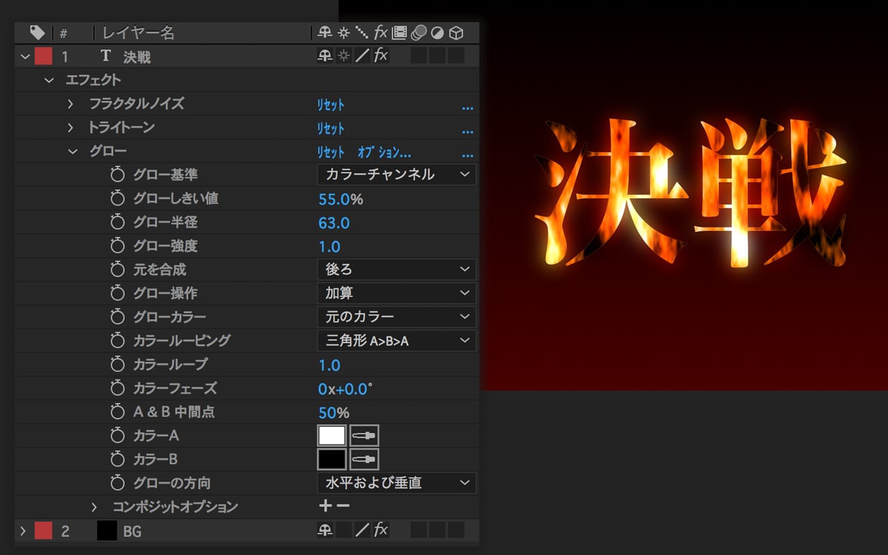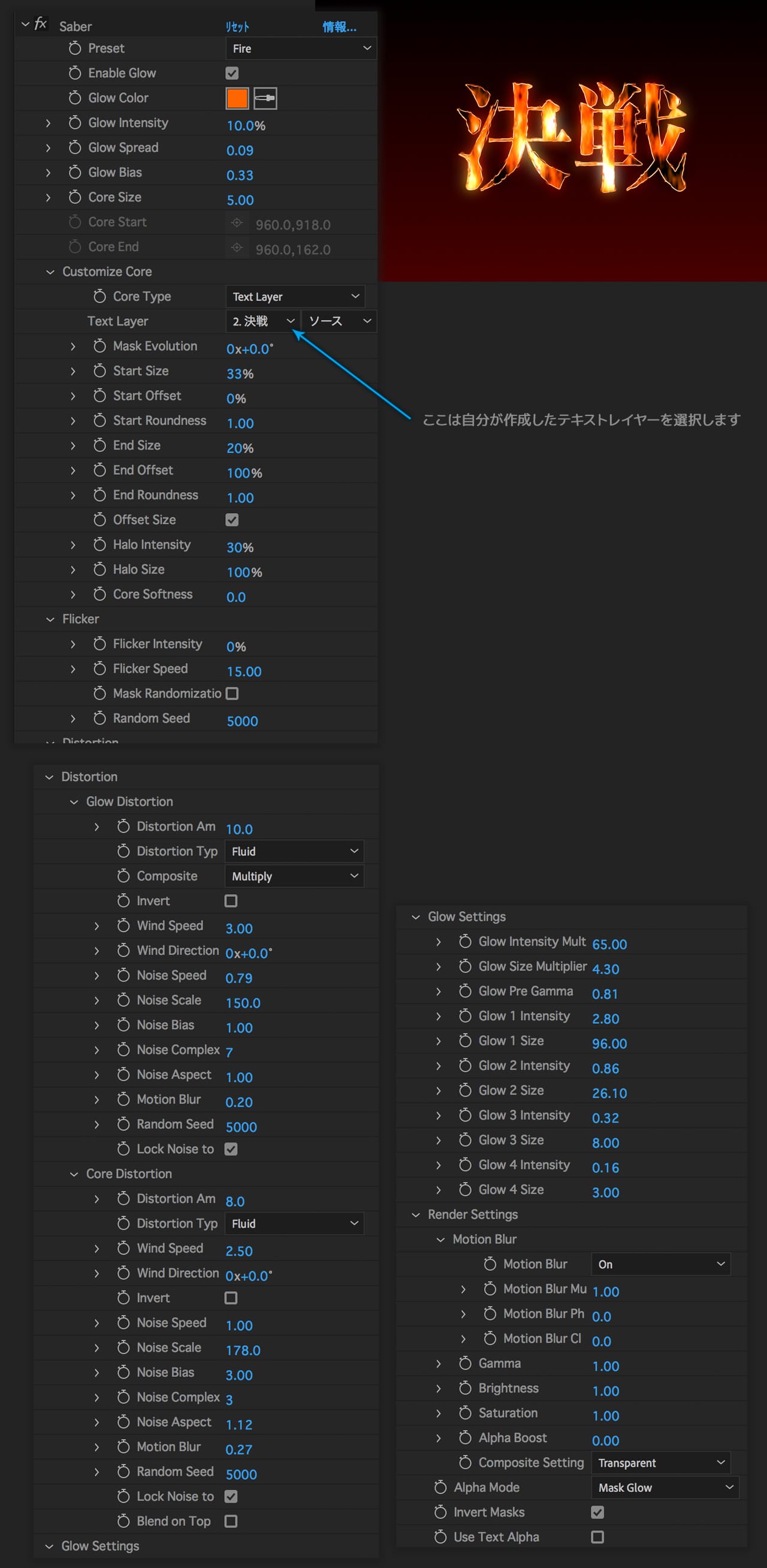 これでテキストの中の炎は完成です。このあと「SABER」エフェクトを使って質感を上げていきます。