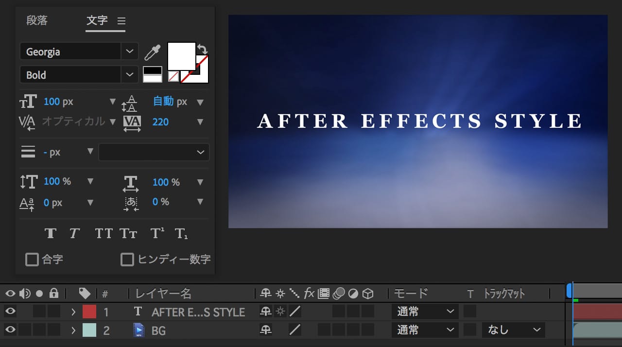 ここでテキストの段落が「中央揃え」になってれば、トラッキングしたときに文字が中央を基点に広がったり縮まったりしてると思います。「中央揃え」になってない方はここで設定してください。