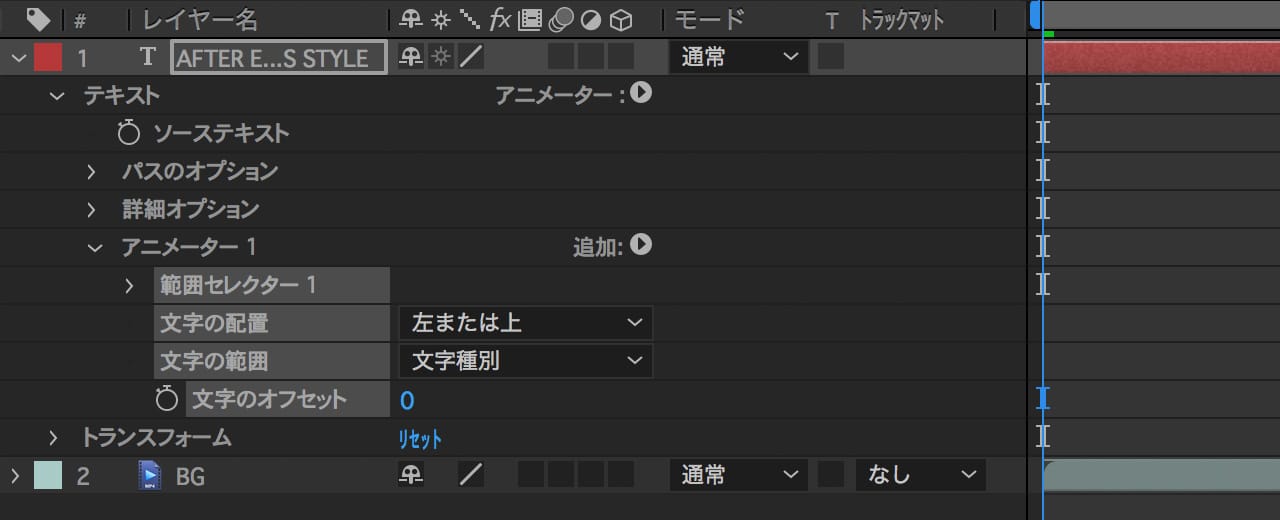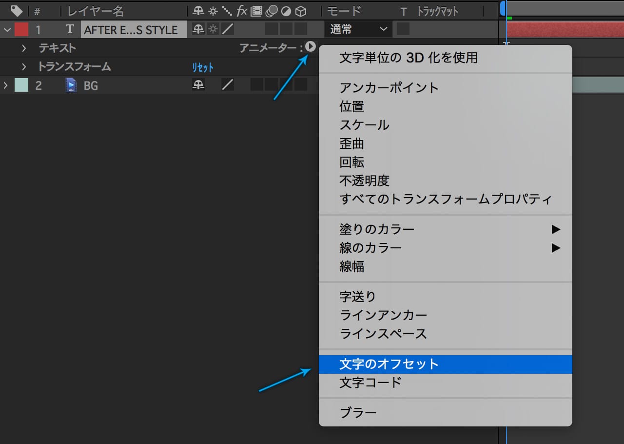 さきほど打ったテキストレイヤーのプロパティを開き、「テキスト」の横にある「アニメータ」→「文字のオフセット」で文字のオフセットプロパティを追加します。