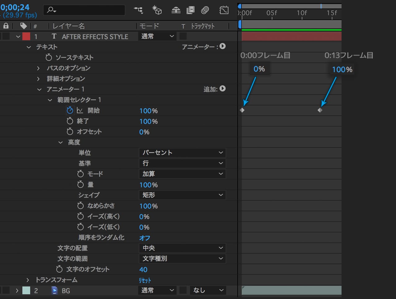 「範囲セレクタ1」の「開始」に0%→100%となるようにキーフレームを打ちます。