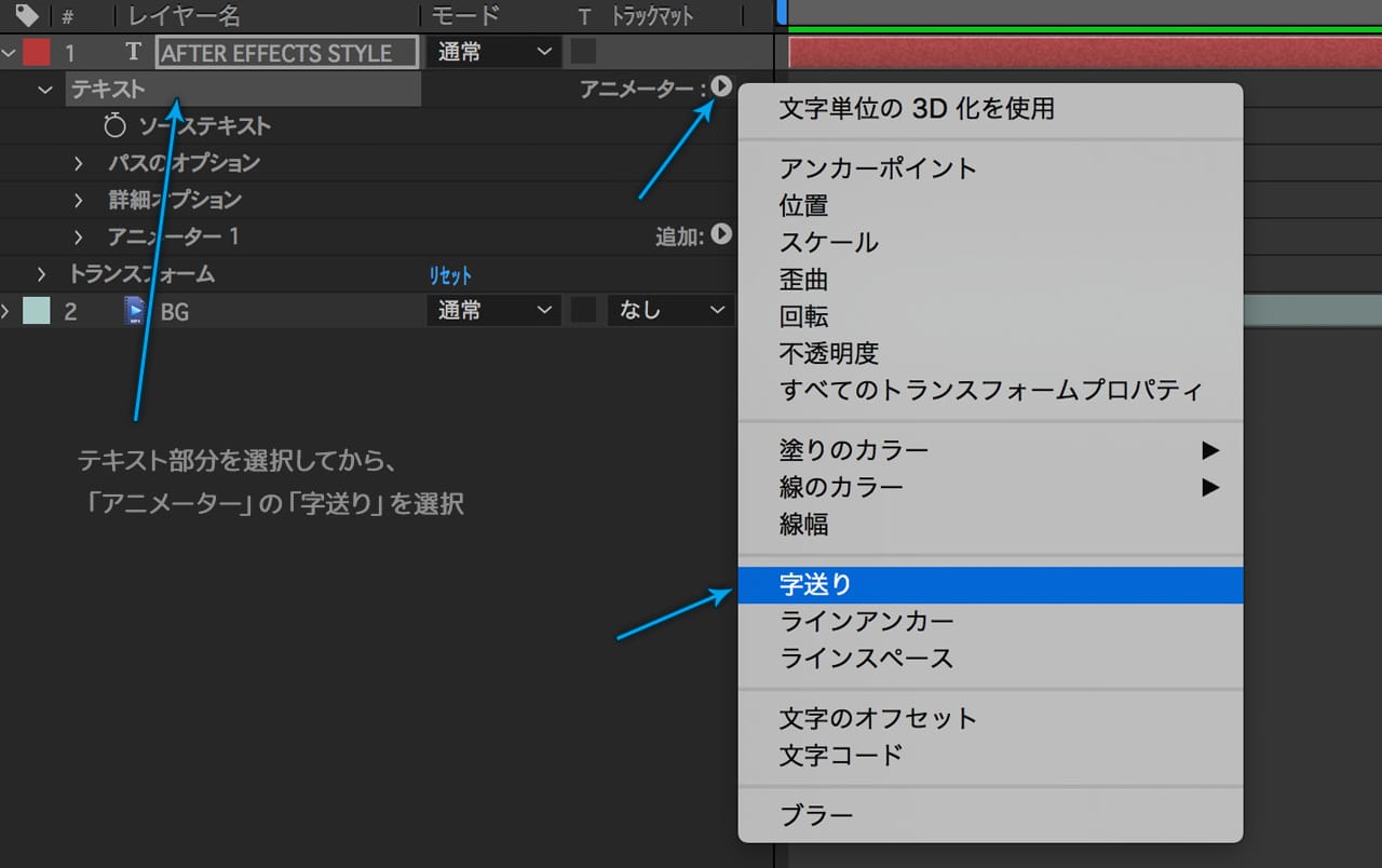 「テキスト」を選択してから「アニメータ」→「字送り」を選択します。