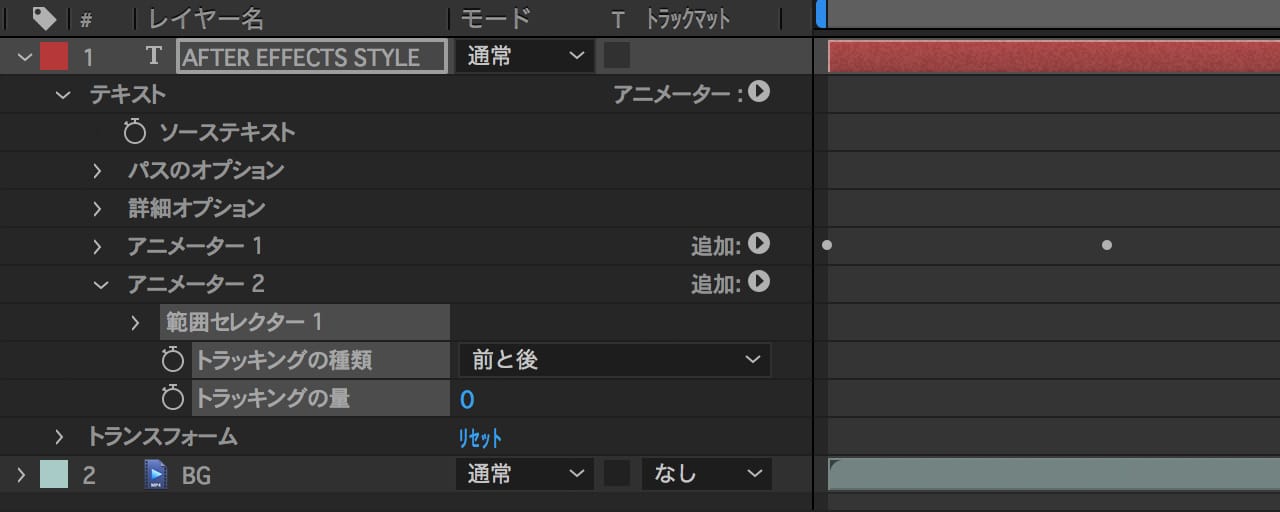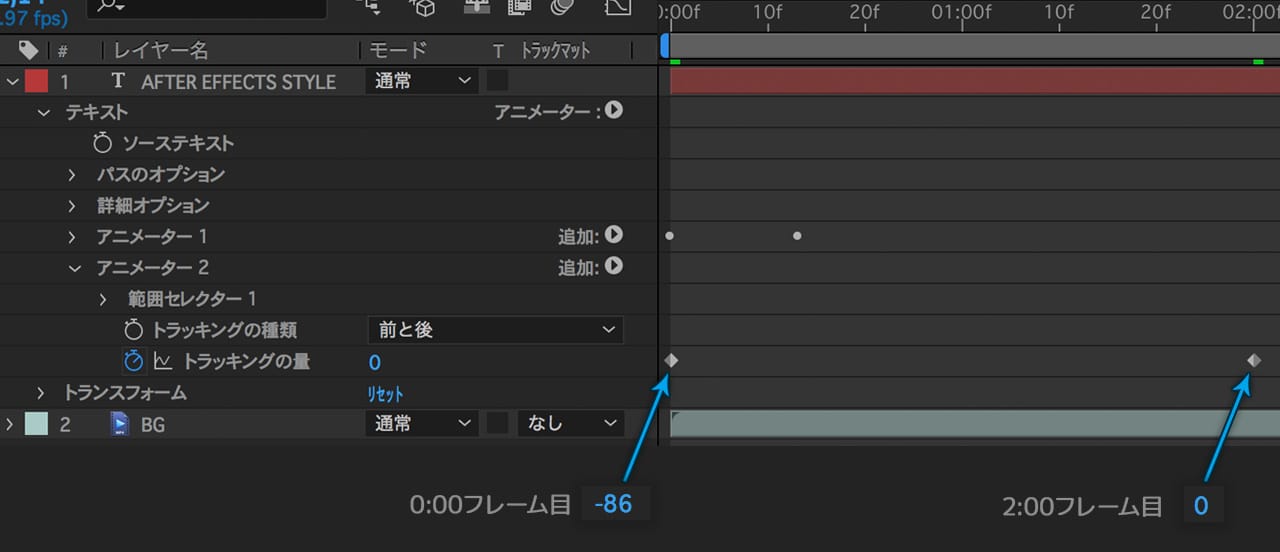 「トラッキングの量」の値が「-86」→「0」とアニメーションするようにキーフレームを打ちます。
