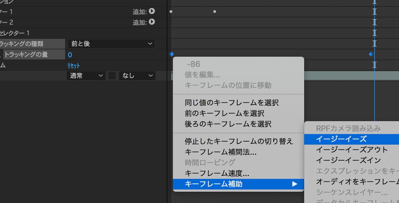 続いて「トラッキングの量」のキーフレームを選択して、右クリックメニューから、「キーフレーム補間」→「イージーイーズ」に変更します。