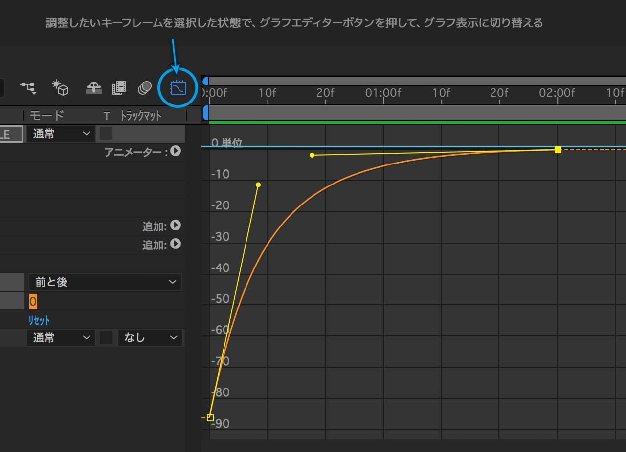 イージングの値をさらに調整します。「トラッキングの量」のキーフレームを選択してから、グラフエディターボタンを押して、グラフ表示に切り替えてください。