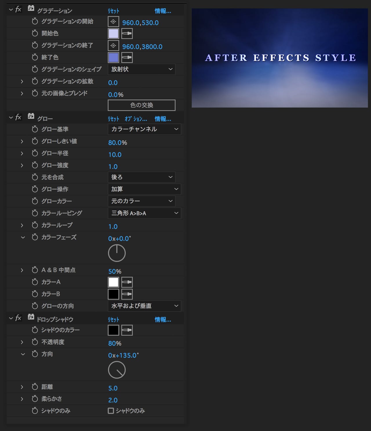テキストレイヤーに「グラデーション」、「グロー」、「ドロップシャドウ」のエフェクトを適用し、画像を参考に値を調整してください。