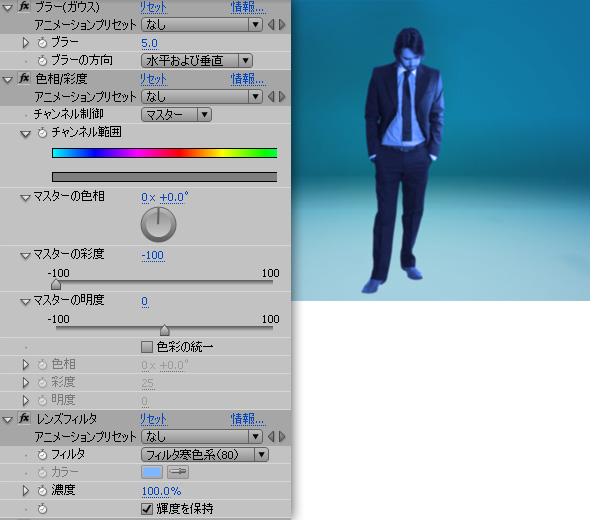 人物の素材をホログラムっぽい色合いにするため、「ブラー(ガウス)」「色相/彩度」「レンズフィルタ」で調整します。画像の値を参考にしてください。