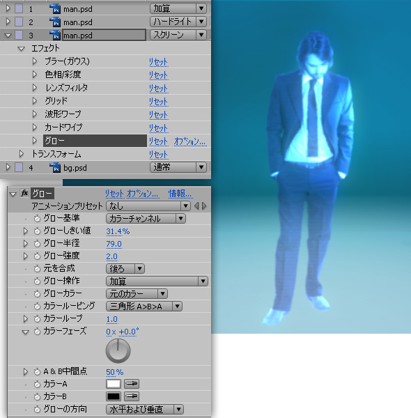 Aharon Rabinowitz氏のホログラムの表現チュートリアル「Creating a Hologram Look in After Effects」を参考に、ホログラムの出現表現と映像の乱れの表現を追加してみました。
