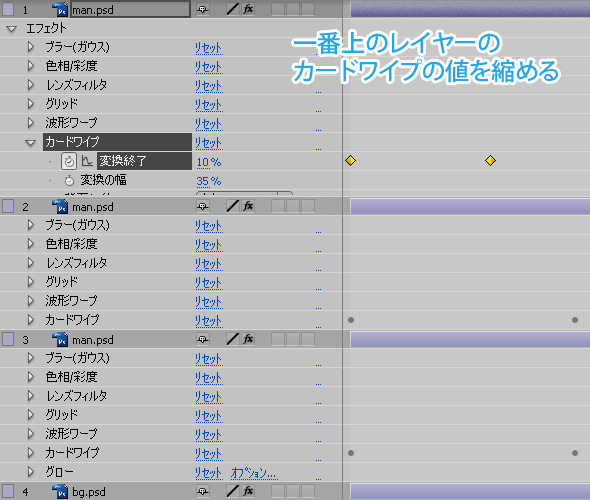 最後に、出現の表現に少し手を加えます。複製した一番上のレイヤーのカードワイプの「変換終了」のキーフレームを他の2つのレイヤーより縮めます。