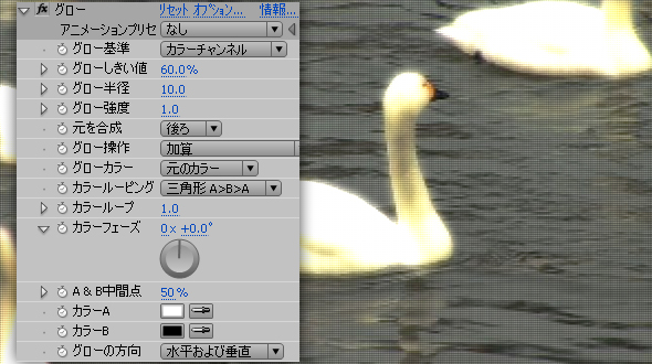 次に「エフェクト」→「スタライズ」→「グロー」を適用します。