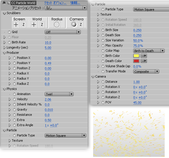 新規平面を作成し、「エフェクト」→「Simulation」→「CC Particle World」を適用し、画像のように値を変更します。
