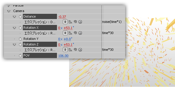 「FOV」の値を「106.00」に変更し、それぞれのプロパティに次のエクスプレッションを書きます。「Distance」のエクスプレッション