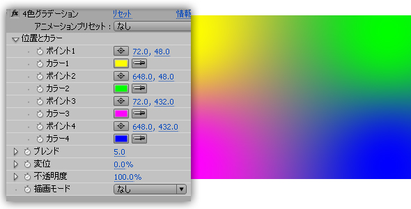 新規平面を作成し、「エフェクト」→「描画」→「4色グラデーション」を適用します。色は自由に変更して構いません。