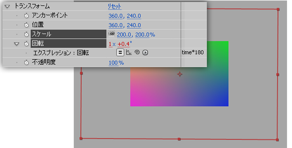 続いてこの4色グラデーションを回転させます。このまま回転させると下地が見えてしまうので、「スケール」を「200%」に変更します。