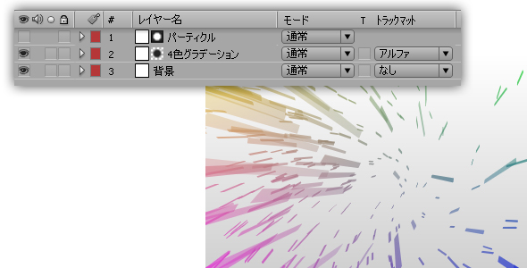 パーティクルレイヤーの下に4色グラデーションレイヤーを移動させ、4色グラデーションレイヤーの「トラックマット」を「アルファマット」に変更します。