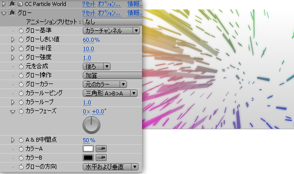 最後にパーティクルレイヤーに「エフェクト」→「スタライズ」→「グロー」を適用します。