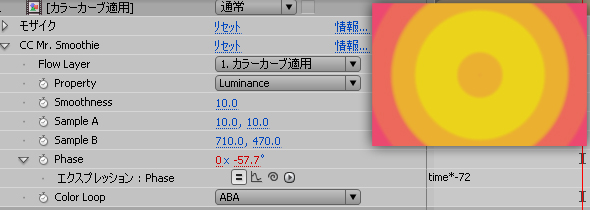 最後にエフェクトの「CC Mr.Smoothie」を適用し、「Phase」に以下のエクスプレッションを書きます。