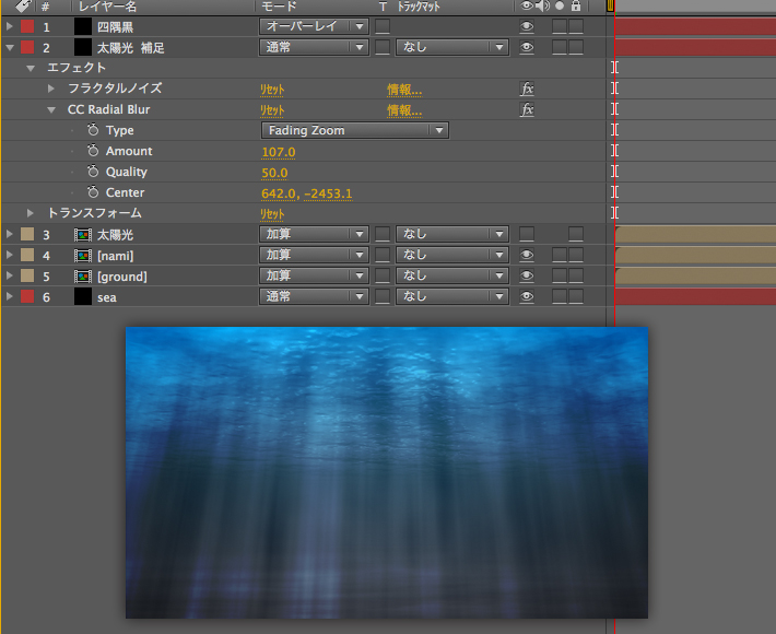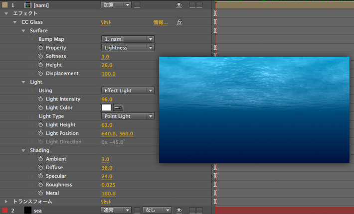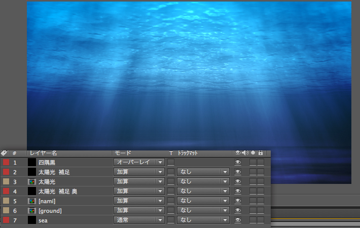 このあと作る地面も差す太陽光もこの「nami」コンポジションを元に作ります。そうすることで海面の波の動きと光の動き、地面の光の反射の動きが近くなりリアル感が増します。