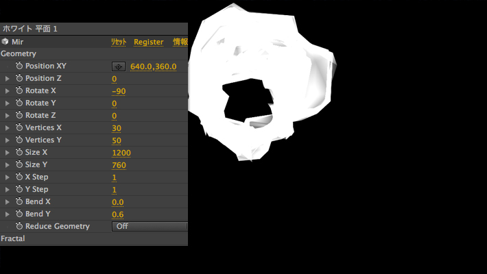 Mirエフェクトの「Fractal」「Shader」パラメーターを以下のように設定します。