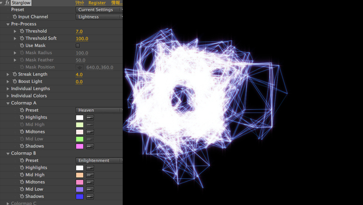 次に「Trapcode Starglow」を適用し、パラメーターを以下のように調整します。