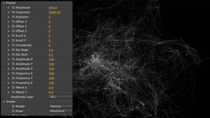 新規平面レイヤーを作り、「Trapcode Mir」エフェクトを適用します。「Fractal」パラメータの「Amplitude」を500、「Frequency」を1000に変更し、「Shader」のパラメータの「Draw」をWireframeに設定します。