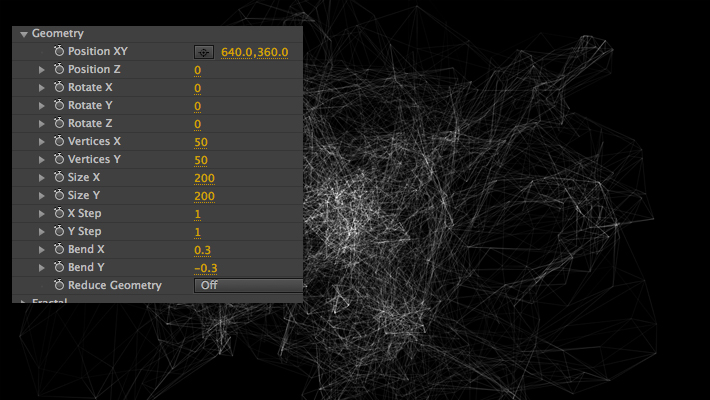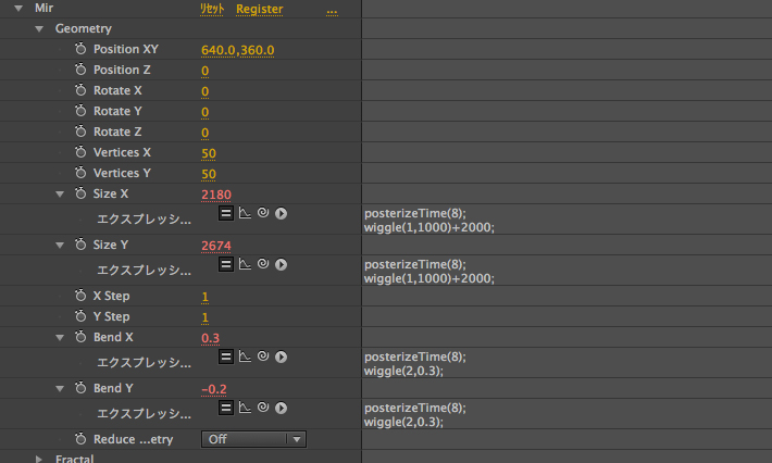 次にランダムな動きを付けます。「Geometry」パラメータの「Size X」「Size Y」「Bend X」「Bend Y」に以下のエクスプレッションを書きます。