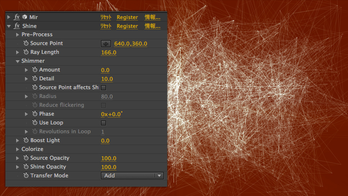 「Trapcode Shine」エフェクトを適用し「Ray Length」プロパティを166に、「Transfer Mode」をAddに変更して完成です。
