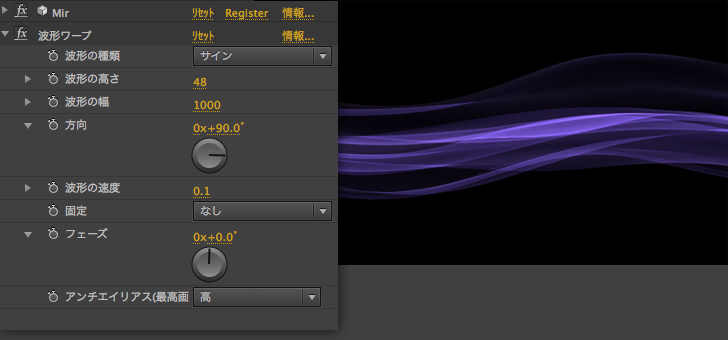 「MIR」レイヤーにエフェクトの「波形ワープ」を適用します。