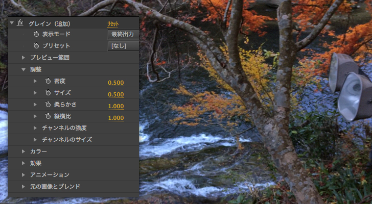 まずはエフェクトの「グレイン(追加)」を適用し、「調整」パラメータの「密度」「サイズ」を画像のように調整します。