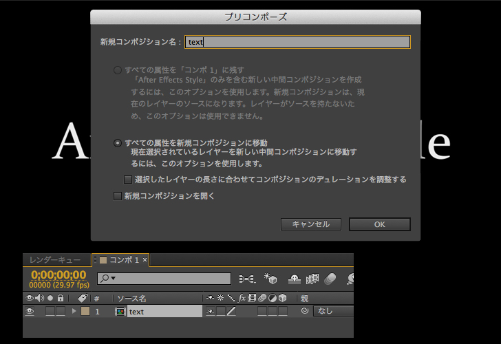 このテキストレイヤーをプリコンポーズし、「text」と名前をつけます。