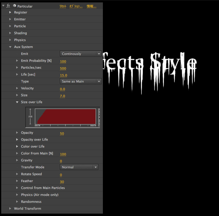 次に「Particle」パラメータを調整します。「Life [sec]」を「15」に設定します。今回は15秒で作成していきますが、ここを変更すると垂れる具合を変更することができます。この段階では変更しても変化ありませんが、最終的に垂れ具合を変えたい場合はここを調整してみてください。